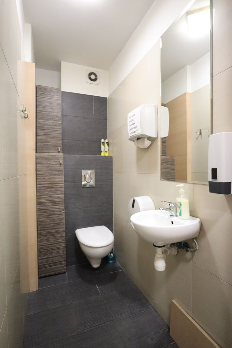 Łazienka z sanitariatami, glazura i terakota. Na podłodze w całym lokalu terakota, ściany malowane na biało.