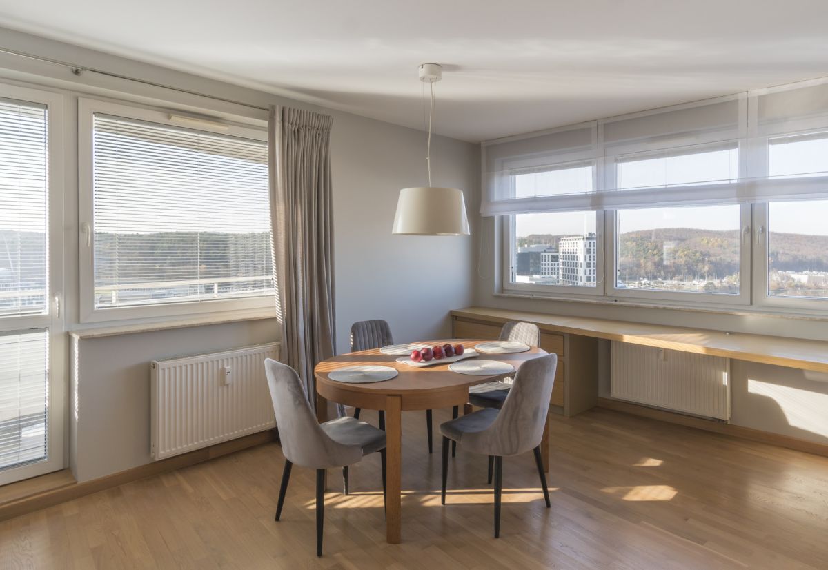 Obecnie, po zmianie aranżacji, lokal posiada duży, komfortowy salon (33,20m2) z aneksem kuchennym we wnęce (9,50m2). Wydzielona została tu strefa wypoczynku z sofą i narożnikiem, dodatkowo jadalnia oraz miejsce do pracy wzdłuż dużego okna z widokiem na panoramę miasta.