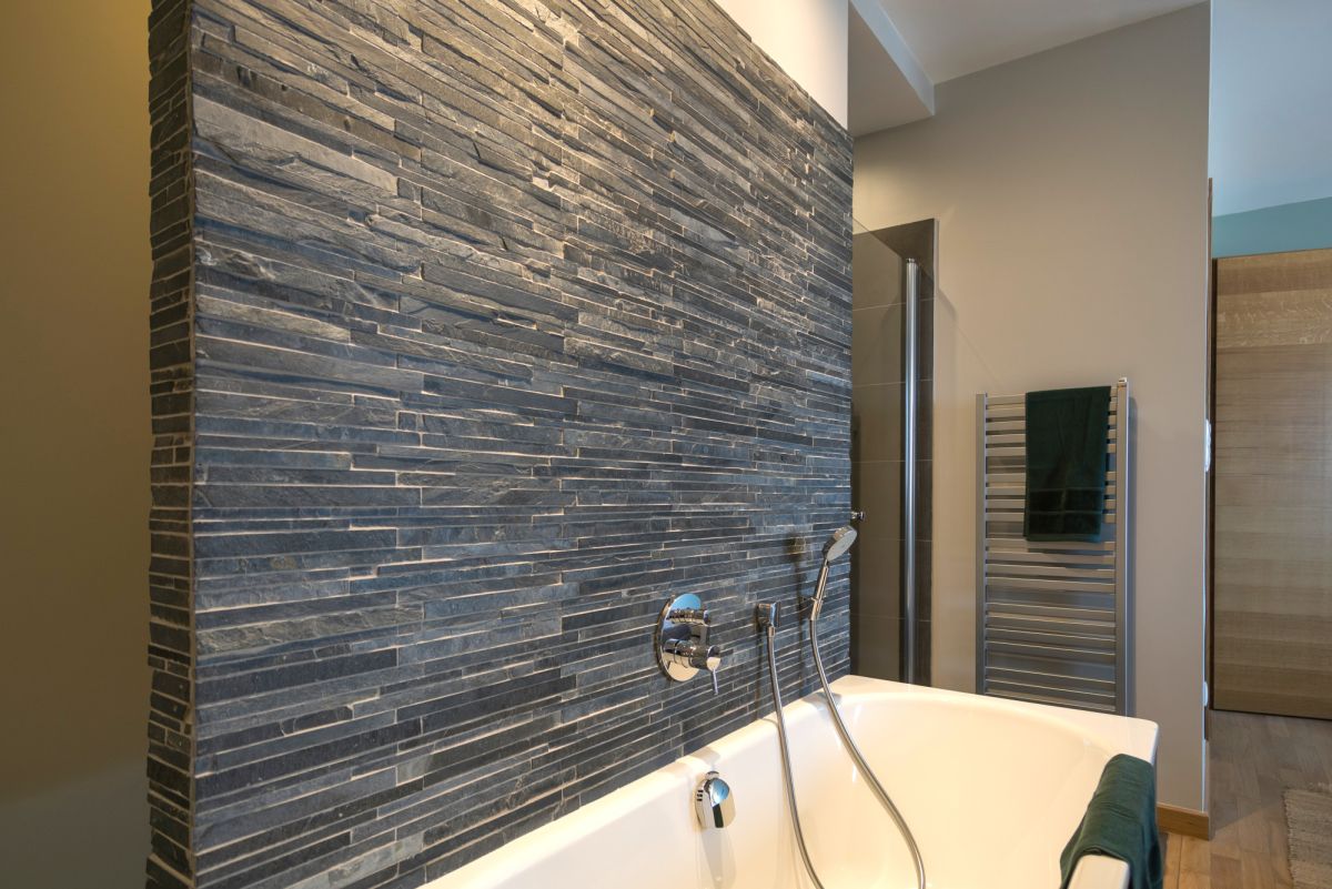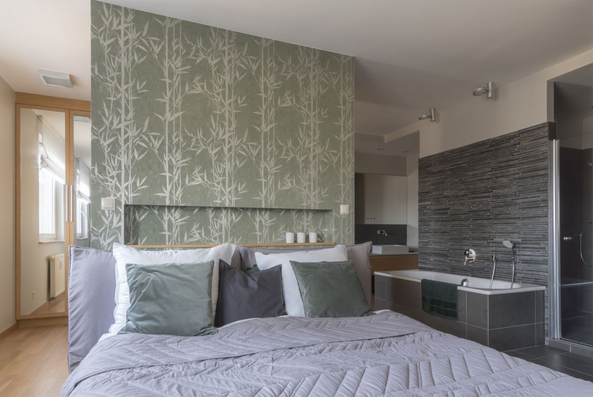 W drugim pomieszczeniu znajduje się duża, niestandardowo zaaranżowana sypialnia (33m2) połączona z otwartym pokojem kąpielowym i gustownie zabudowaną garderobą. W centralnym miejscu znajduje się duże łóżko, za jego wezgłowiem znajduje się garderoba. Bezpośrednio z sypialni jest wejście do dużej zamykanej kabiny prysznicowej, oprócz niej w sypialni znajduje się wanna, duży podwieszany blat z umywalką oraz dyskretnie umiejscowiona toaleta.