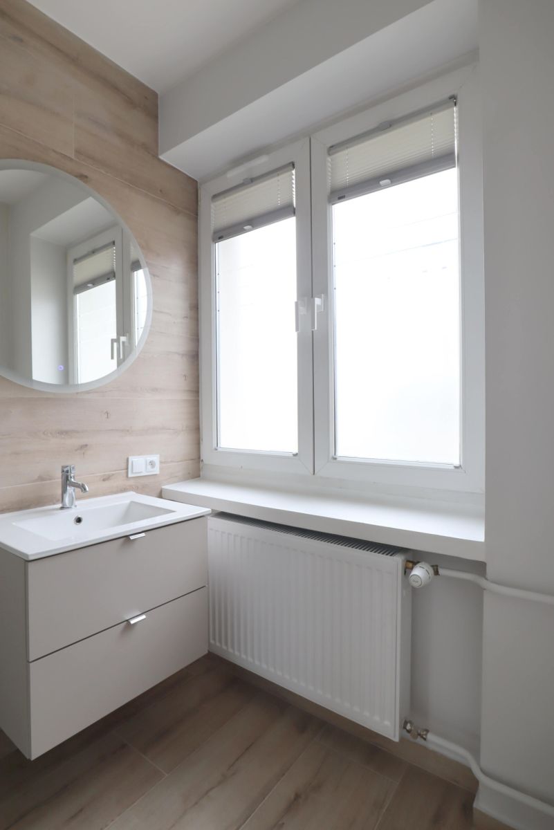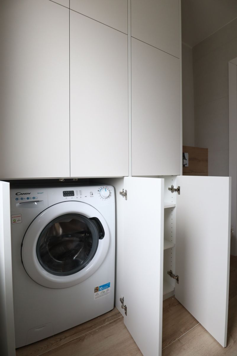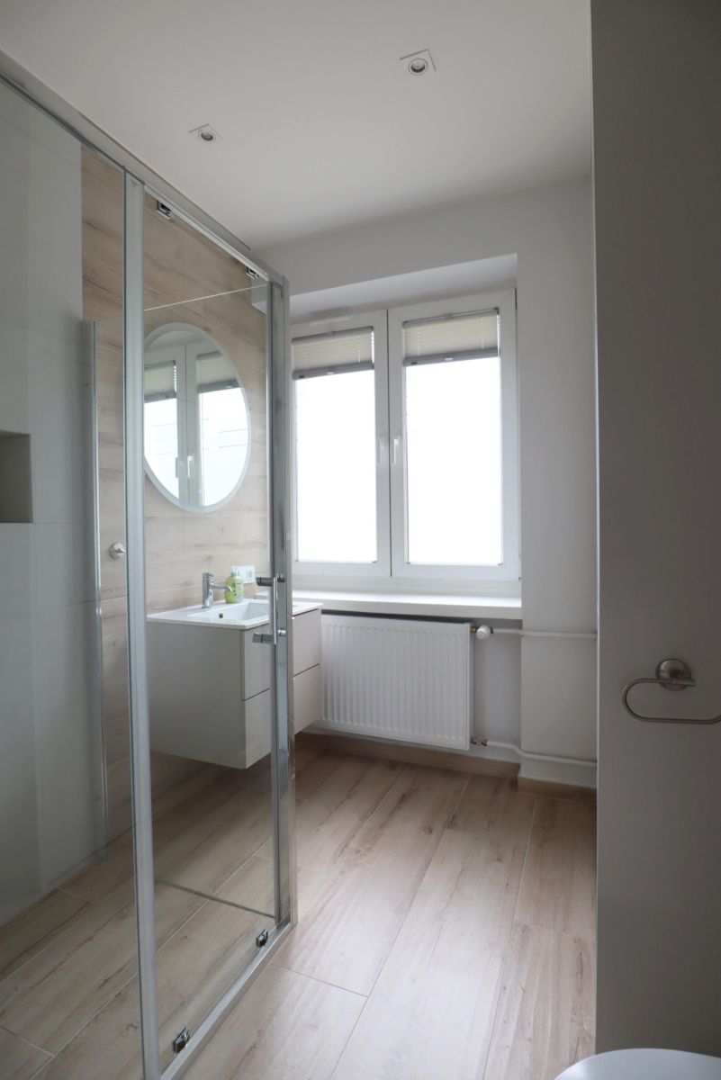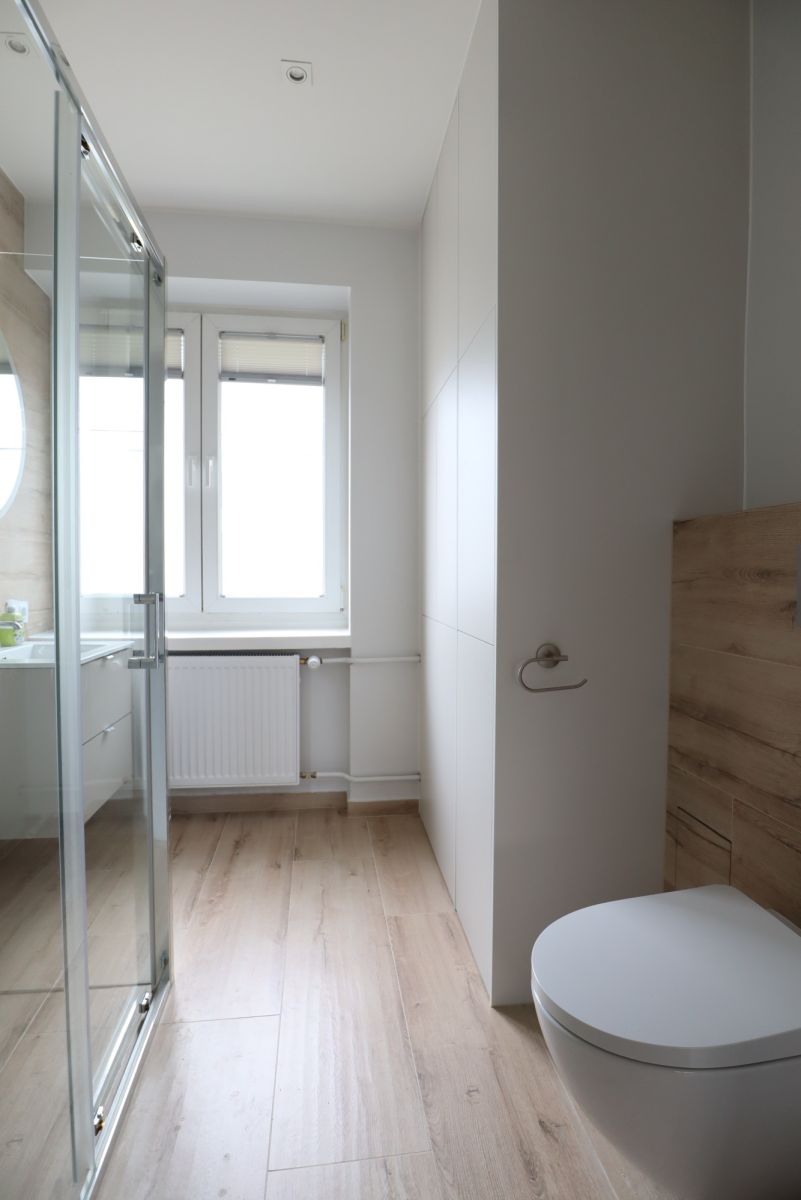 Wygodna, przestronna łazienka (5m2) z oknem posiada dużą kabinę prysznicową z odpływem liniowym. Biała glazura i terakota imitująca drewno dodają temu pomieszczeniu elegancji i ponadczasowego charakteru. Zabudowa pod wymiar mieści pralkę oraz zawiera dużo miejsca do przechowywania.