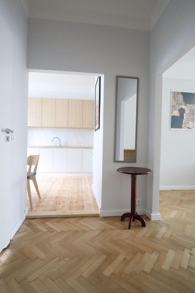 W pokoju i korytarzu na podłogach parkiet, w kuchni panele drewniane, ściany malowane.